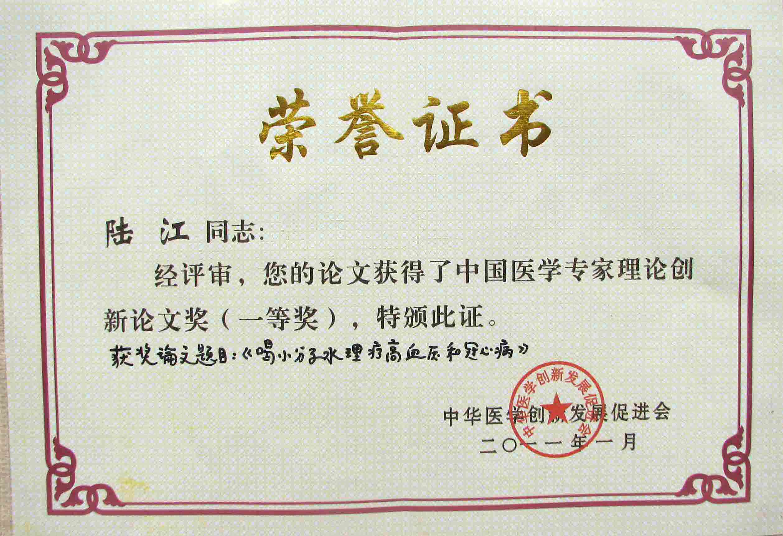 新疆63歲的賀兆生飲用一年,冠心病未愈,他用電話介紹是食堂管理員,問他食量多少?說吃七八分飽,睡前還吃兩袋牛奶,陸 江說我在論文和書中多次批判“吃七八分飽”,關(guān)照患者務(wù)必用“己饑方食”控制主食肉食量,要他把牛奶改在早中餐吃,減少主食肉食量,建議不吃晩餐,晚上只吃一個蘋果,再經(jīng)幾個月補(bǔ)水節(jié)食,治愈了21年的冠心病和肥胖、失眠等病,信中由衷地感激陸 江為再生父母。[13]因?yàn)獒t(yī)生從未過問他的膳食習(xí)慣,只管開處方藥或手術(shù),父母也不會叫他不吃晩飯。
